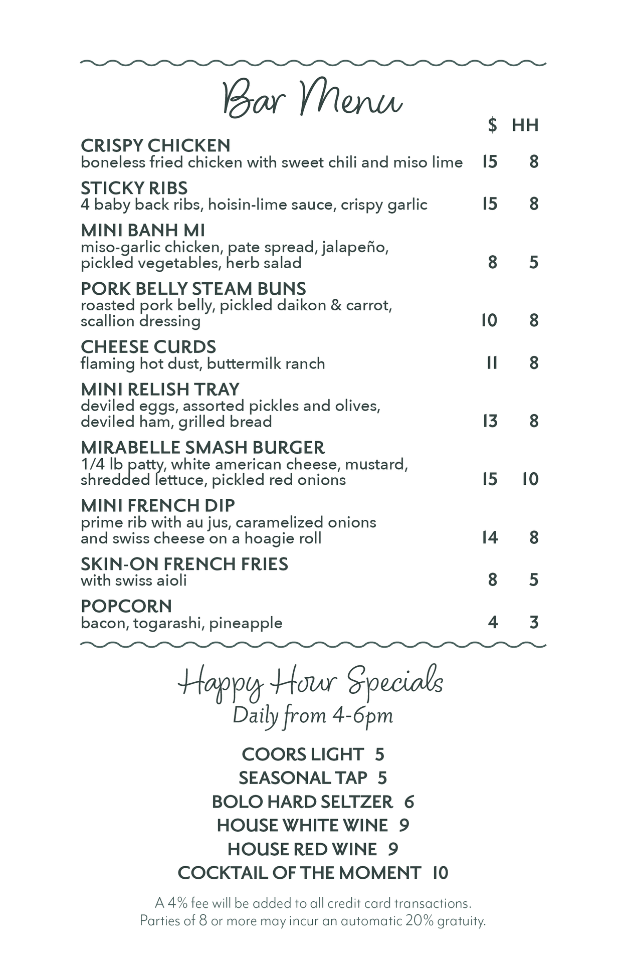 Join us at Mirabelle for a relaxed yet elevated happy hour experience featuring handcrafted cocktails, curated wines, local beers, and chef-driven small plates. Whether you’re meeting friends after work, kicking off date night, or easing into the weekend, our happy hour menu offers the perfect balance of approachable favorites and refined flavors in a warm, welcoming setting.